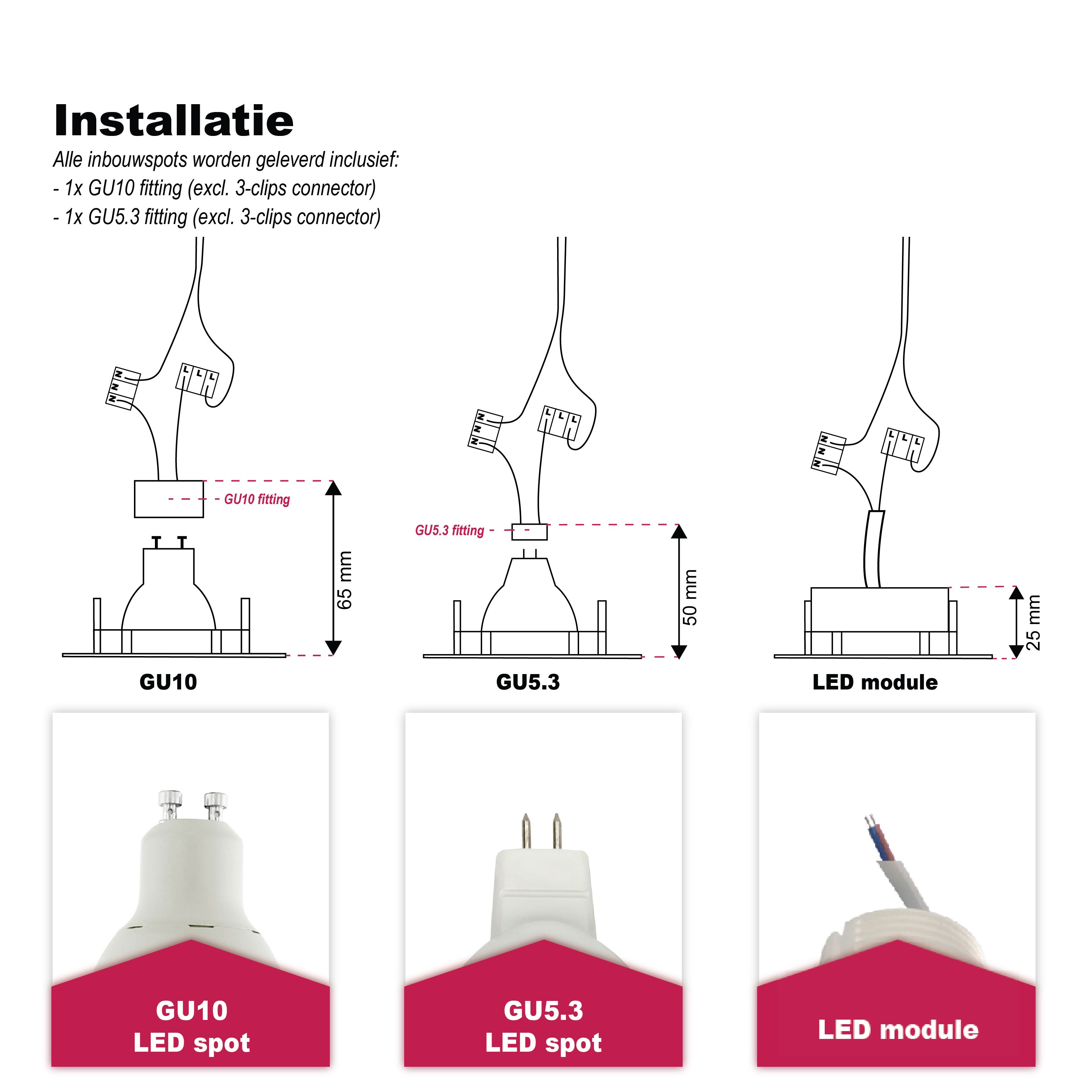• 1 x GU10 (MR16), GU5.3 (MR16) lamphållere (exkl. ljuskälla)